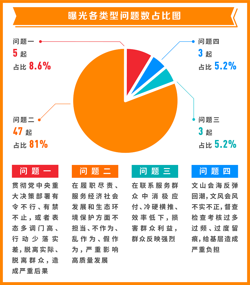 从具体问题类型看,“贯彻党中央重大决策部署有令不行、有禁不止,或者表态多调门高、行动少落实差,脱离实际、脱离群众,造成严重后果”方面问题5起,占比8.6%;“在履职尽责、服务经济社会发展和生态环境保护方面不担当、不作为、乱作为、假作为,严重影响高质量发展”方面问题47起,占比81%;“在联系服务群众中消极应付、冷硬横推、效率低下,损害群众利益,群众反映强烈”方面问题3起,占比5.2%;“文山会海反弹回潮,文风会风不实不正,督查检查考核过多过频、过度留痕,给基层造成严重负担”方面问题3起,占比5.2%。