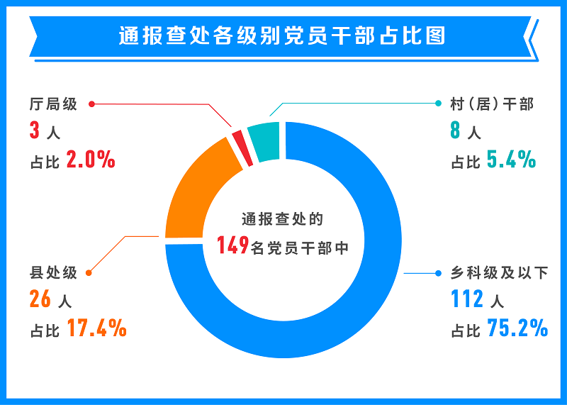 从处理各级别党员干部人数看,通报的58起典型问题,查处的149名党员干部中,村(居)干部8人,占全部人数5.4%;乡科级及以下112人,占全部人数75.2%;县处级26人,占全部人数17.4%;地厅级3人,占全部人数2.0%。通报数据印证,重点整治群众身边特别是群众反映强烈的形式主义、官僚主义突出问题十分必要。